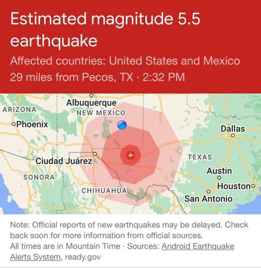 El Servicio Geológico de los Estados Unidos informa que un terremoto de magnitud 5.5 sacudió el oeste de Texas alrededor de las 3:30 p.m. de este Miércoles.