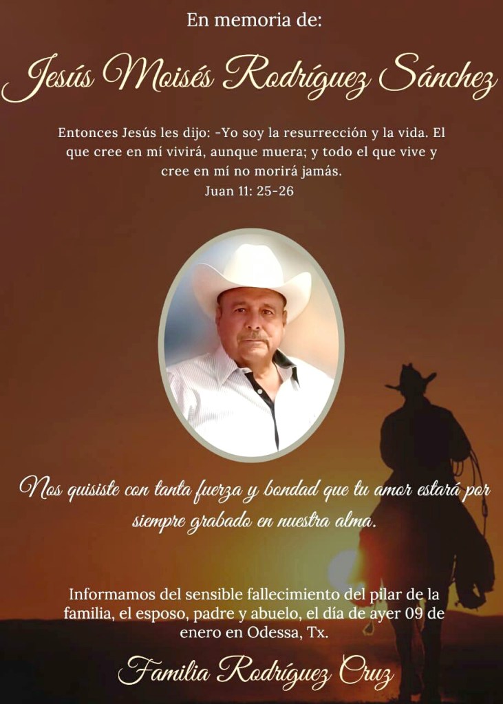 Con profunda tristeza, por este medio comunicamos el sensible fallecimiento del Sr. Jesús Moisés Rodríguez Sánchez, de 69 años de edad, acaecido el 09 de enero del 2023 en el Hospital Medical Center de Odessa Tx.
