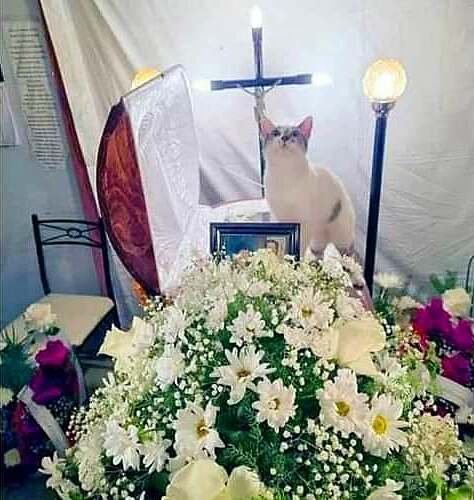 “Niña” se subió al ataúd y miró hacia adentro para ver qué había allí. La gatita quedó impactada, pues allí estaba su dueña, una señora de avanzada edad.