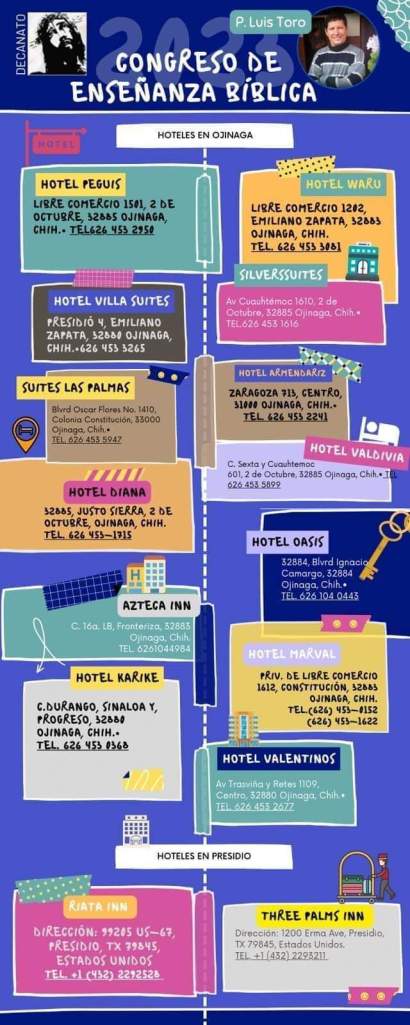 GENERAL,LOCAL,REGIONAL Queridos hermanos: A tan solo unos días de nuestro encuentro bíblico, preparémonos en oración para que haya mucho fruto. Empezaremos con la Santa Misa a las 10 de la mañana. 13 de marzo de 2023 mone1970 Deja un comentario Aquí algunos de los hoteles de nuestro Ojinaga para los que quieran reservar. ✍Parroquia de Jesús Nazareno Comparte esto: Haz clic para compartir en X (Se abre en una ventana nueva) X Haz clic para compartir en Facebook (Se abre en una ventana nueva) Facebook Haz clic para compartir en WhatsApp (Se abre en una ventana nueva) WhatsApp Haz clic para compartir en Threads (Se abre en una ventana nueva) Threads Haz clic para compartir en X (Se abre en una ventana nueva) X Me gusta Cargando... Relacionado