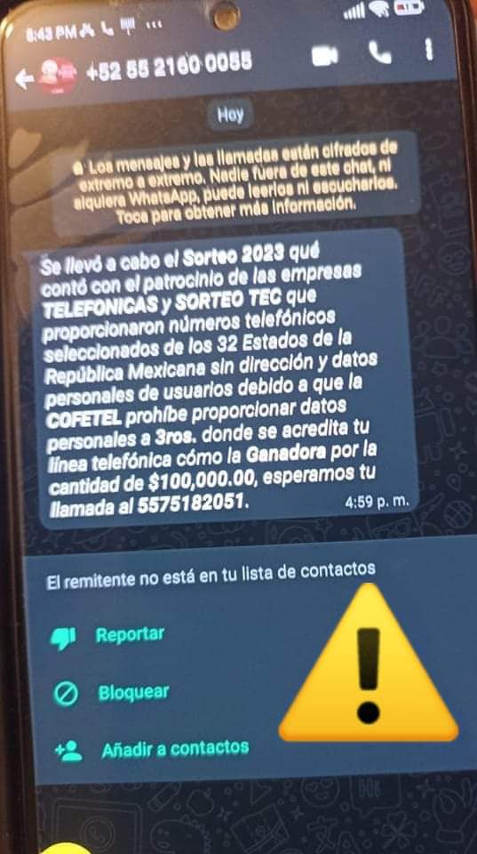 “Se llevó a cabo el Sorteo 2023 qué conto con el patrocinio de las empresas TELEFONICAS Y SORTEO TEC que proporcionaron números telefónicos seleccionados de los 32 Estados de la República Mexicana sin dirección y datos personales de usuarios debido a que la COFETEL prohíbe proporcionar datos personales a 3ros. donde se acredita tu línea telefónica cómo la Ganadora por la cantidad de $100,000.00, esperamos tu llamada al 5575182051”.