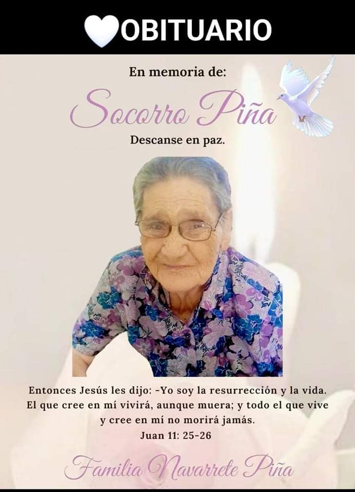 A familiares y amistades de la Sra. Socorro Piña Bustamante les comunica su sensible fallecimiento el día de hoy a la edad de 89 años.