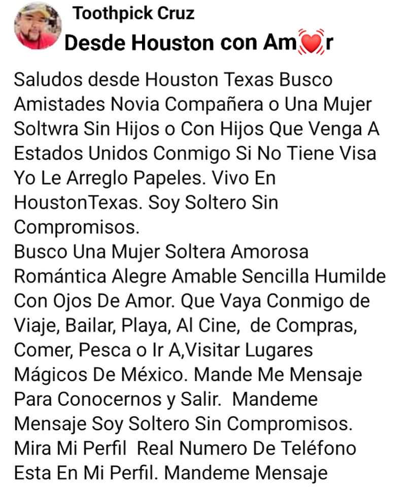 «Saludos desde Houston Texas, Busco Amistades, Novia, Compañera o Una Mujer Soltera Sin Hijos o Con Hijos Que Venga A Estados Unidos Conmigo, Si No Tiene Visa Yo Le Arreglo Papeles. Vivo En HoustonTexas. Soy Soltero Sin Compromisos.