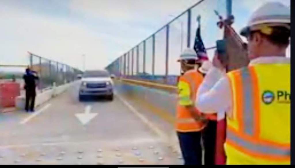 El mayor de presidio John Ferguson en compañía de un empresario local realizaron el primer recorrido por esta parte del puente que aún sigue en construcción; justo en el límite entre ambos países se realizó una pequeña ceremonia por la apertura al paso vehicular en la parte nueva de dicho puente en donde funcionarios del departamento de transporte de Texas y funcionarios mexicanos les dieron la bienvenida.