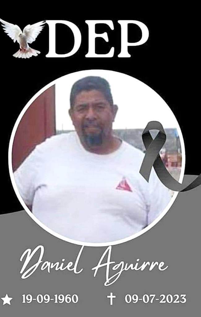 A familiares y amistades del Sr. Daniel Aguirre Ibarra se les comunica su sensible fallecimiento el día de hoy a la edad de 62 años. Será velado este lunes en funeraria De Valle 1, los servicios funerarios serán este martes.