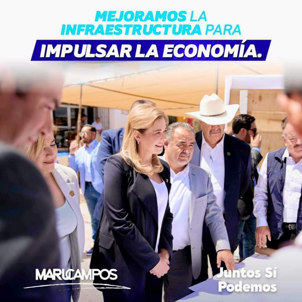 Local.- Con la frase “Mejoramos la infraestructura para impulsar la economía”, la Gobernadora del Estado la Maestra María Eugenia Campos Galván, hace referencia al excelente trabajo que ha realizado al frente del Estado apostándole a un mejor Chihuahua, acompañando a la frase, una imagen en donde aparece el alcalde Municipal Andrés Ramos de Anda, a su lado, ya que es esta frontera uno de los municipio que más infraestructura ha tenido gracias a la buena administración del Presidente Municipal y la coordinación que se tiene entre Municipio y Estado.