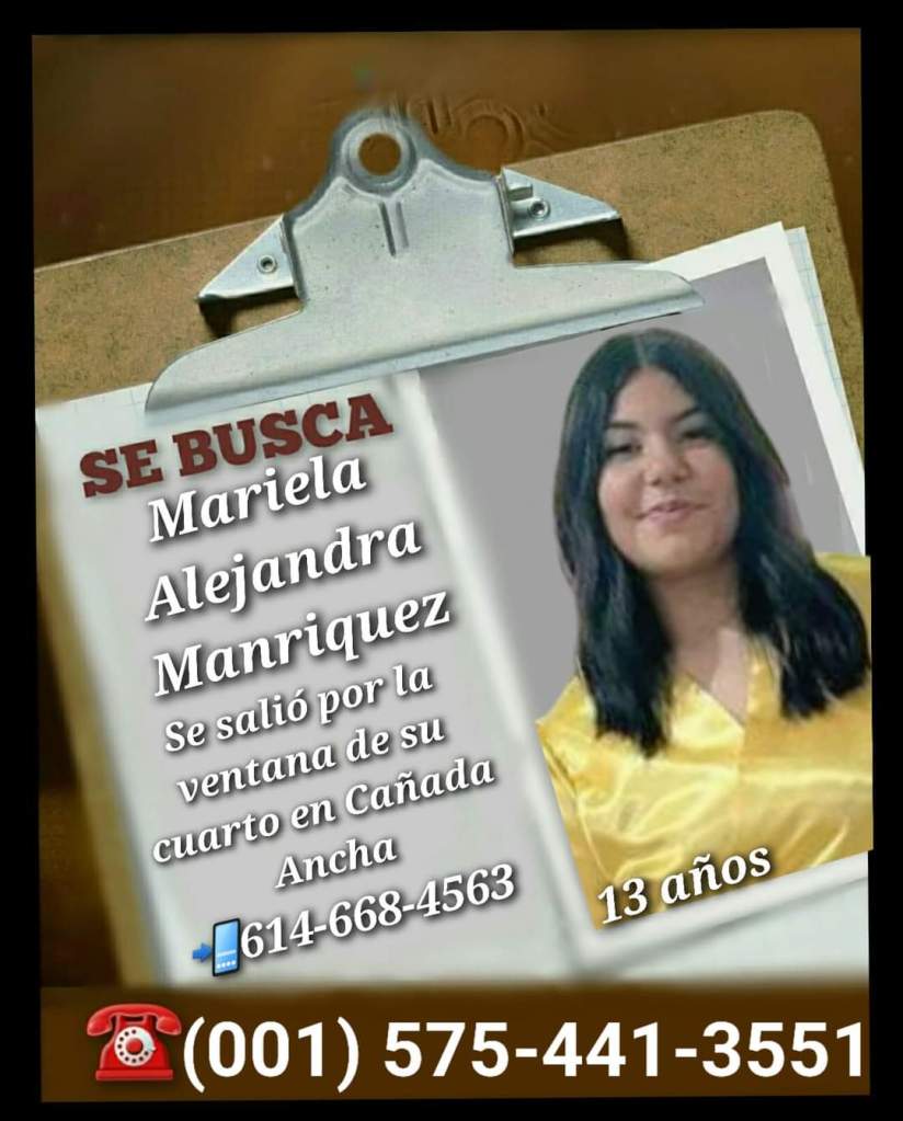 Se llama mariela Alejandra Manriquez, tiene 13 años trae pantalonera negra y sueter gris, pelo negro asta media espalda. El dia de hoy se salio por la ventada de su cuarto en domucilio ubicado en la alle segunda y Degollado de Cañada Ancha .