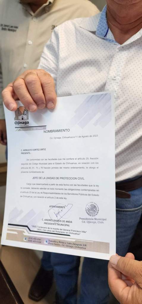 OJINAGA.- Durante la mañana de este viernes el C. Andrés Ramos de Anda, hace entrega del nombramiento oficial de quien ocupara la dirección de Protección Civil a partir de este 11 de agosto.