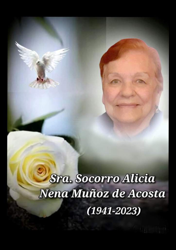 Con Profunda Pena y Tristeza Participamos el Sensible Fallecimiento de la Estimada Dama Ojinaguense Sra. Socorro Alicia (Nena) Muñoz de Acosta el día de hoy en la Ciudad de Chihuahua a la Edad de 82 Años.