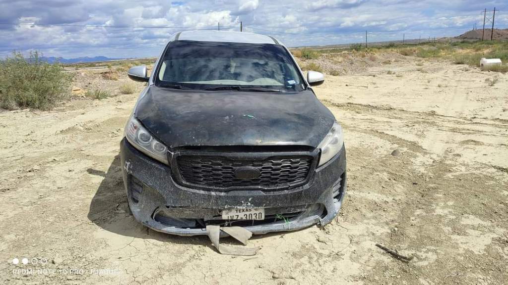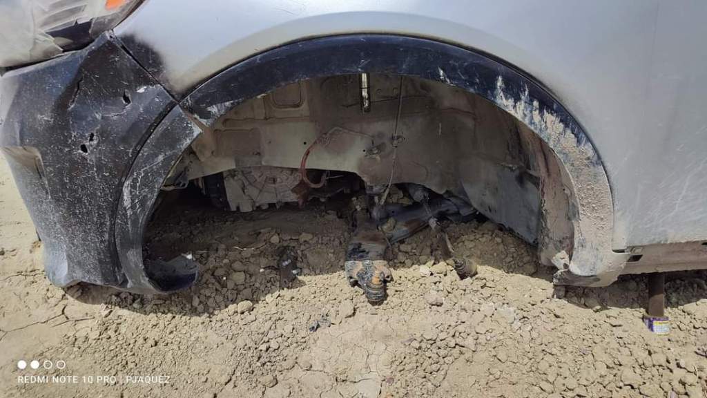 Se trata de una camioneta Kia, Sorento, color gris, placas de Texas, MSY0661, la cual presenta una descompostura mecánica a simple vista, pues le falta la suspensión y todos los fierros del neumático delantero del lado izquierdo.