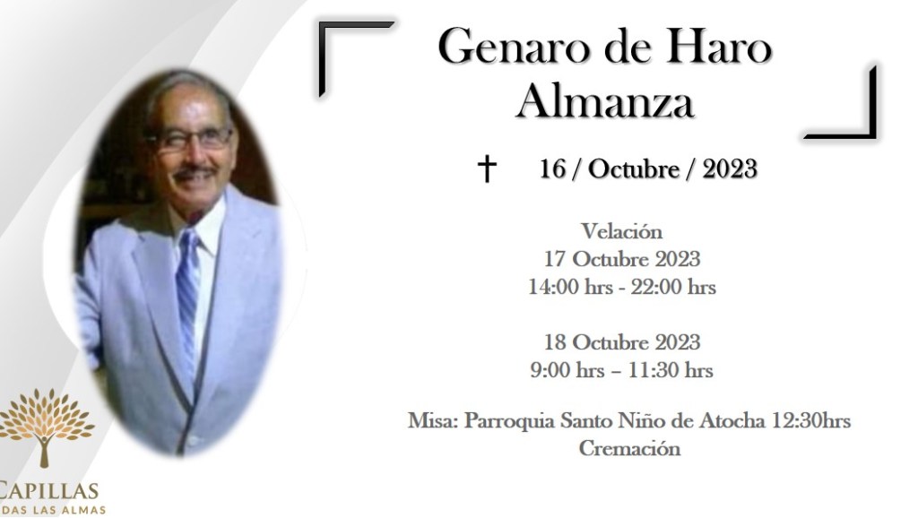 Participamos del sensible fallecimiento del Sr. Genaro de Haro Almanza el día de hoy en Chihuahua, Chih., a la edad de 87 años, será velado en la funeraria Angeles Vallarta, en Av. Zaragoza 706 22-A, Col. Las Granjas.