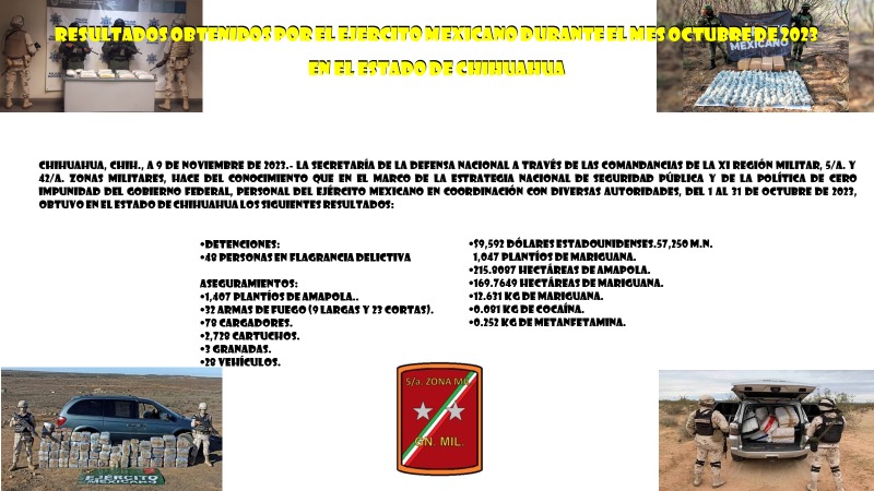 del Ejército Mexicano en coordinación con diversas autoridades, del 1 al 31 de octubre de 2023, obtuvo en el