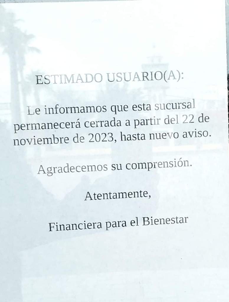 Le informamos que esta sucursal permanecera cerrada a partir del 22 de noviembre de 2023, hasta nuevo aviso.