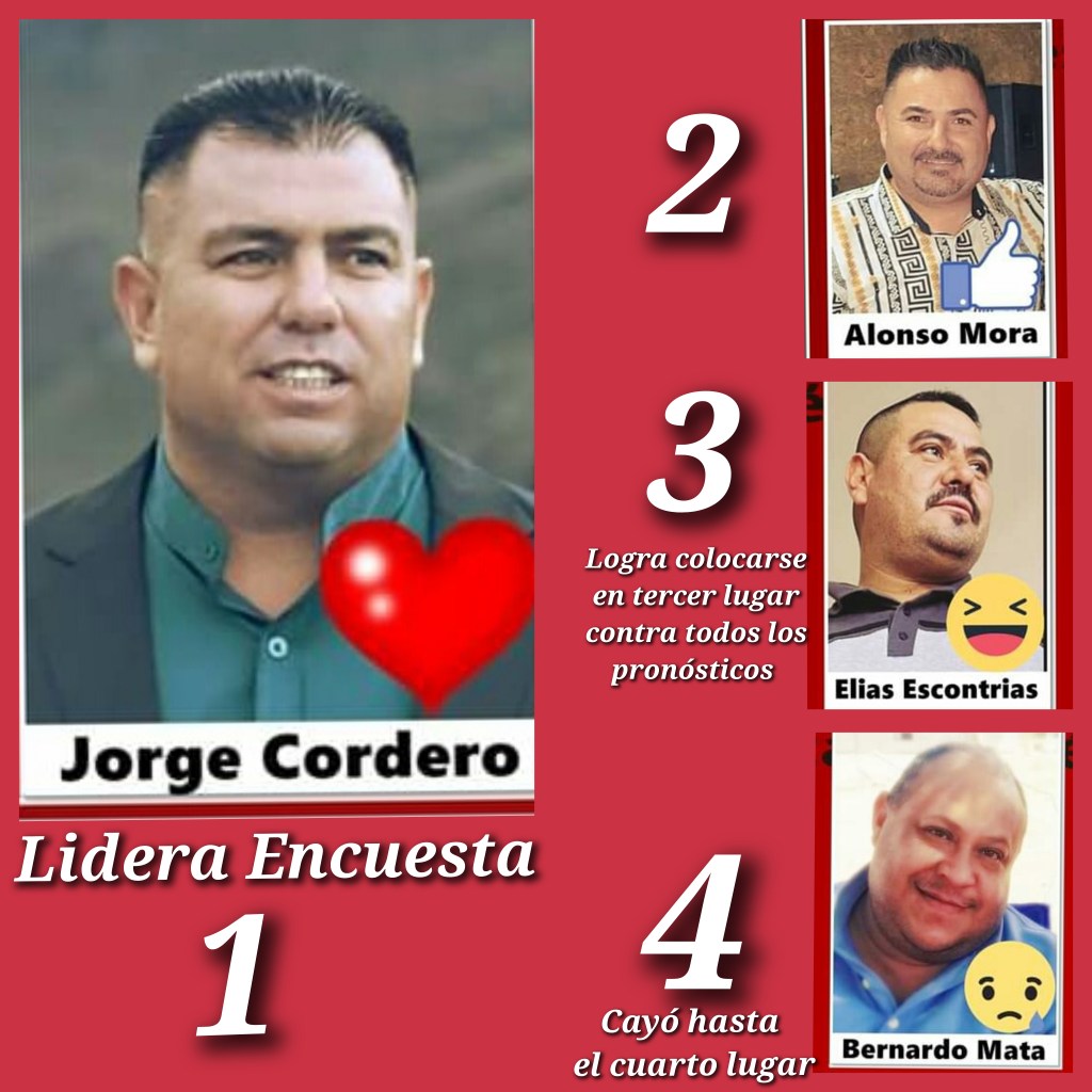 EN ENCUESTA REALIZADA POR OJINAGA NOTICIAS EN SUS DIFERENTES PÁGINAS Y GRUPOS SOBRE QUIEN PODRIA SER EL CANDIDATO DE MORENA A LA PRESIDENCIA MUNICIPAL DE OJINAGA, EL C. JORGE CORDERO SE COLOCA EN PRIMER LUGAR CON %48, SEGUIDO POR ALONSO MORA CON %32, EN TERCER LUGAR ELIAS ESCONTRIAS CON %12 Y BERNARDO MATA CAYÓ HASTA LA CUARTA POSICION CON %8.