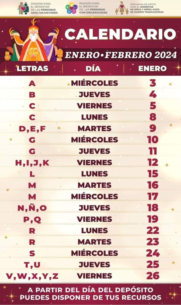 Iniciamos el 2024 con Buenas Noticias, por ello acompañe al Presidente Andrés Manuel López Obrador en la Conferencia Matutina para informar que la Pensión Adulto Mayor aumenta a 6 mil pesos y la Pensión Discapacidad a 3 mil 100 pesos (bimestral), y del 3 al 26 de enero se realizará el depósito del bimestre ENERO-FEBRERO de acuerdo a la letra del primer apellido.