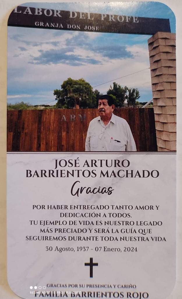 «El día de hoy, 09 de enero del 2024, nos hemos reunido con un solo propósito, con la intención, que es recordar la vida y obra del Maestro José Arturo Barrientos Machado un gran personaje que sin haber nacido en este municipio, pero que desde los tres años de edad radico en el mismo, dejo una profunda huella en nuestra sociedad, al haber educado, a un sinfín de generaciones que no tuvieron más maestro que él y que con sus conocimientos abreviados, les bastó para desarrollarse personalmente, formar sus propias familias y servir a su comunidad.Una de las profesiones más nobles y humanistas que existen, sin duda es la de maestro, que es la que se refiere a la enseñanza, al impartir conocimientos y formar personas en valores y principios que sean útiles a la sociedad en la que viven. El apostolado que representaba a principios del siglo pasado, el ser maestro rural, lo sacó de su natal Cuéntame de Ceniceros, tierra de generales, municipio de Durango a la Hacienda de Orientales, del municipio de Manuel Benavides, para de ahí paras a innumerables poblados rurales de esta comunidad, cómo el Divisadero y de ahí integrarse a las escuelas Manuel Ojinaga e Ignacio Rojas Domínguez de la cual fue su director. En el tiempo en el que el maestro Barrientos Machado se mantuvo frente a grupo, supo sembrar en sus alumnos la semilla del desarrollo personal, del esfuerzo compartido, del compromiso por servir a las mejores causas, del deseo revolucionario por ser mejores a pesar de las circunstancias. Hombre de gran visión, sabía que su papel como maestro, le permitiría acceder a espacios de liderazgo social, de gestor de soluciones a problemas comunes y que la confianza de sus alumnos y sus familias, le obligaban a dar su mayor esfuerzo, a buscar con las autoridades más y mejores estadios de desarrollo y progreso. Lo recordamos hoy, como líder campesino, dirigente del Partido Revolucionario Institucional, instituto político en el cuál militó toda su vida, es por ello que la bandera de su partido cubre hoy su ataúd mortuorio, funcionario honesto y responsable en los diferentes cargos que desempeño como Presidente de la Junta Municipal de agua y Saneamiento y Oficial Mayor de la presidencia municipal, entre otros. Amigo Leal, confiable que veía por todos y a nadie discriminaba. Hablar del maestro Arturo Barrientos Machado, es tener presente un gran legado político, social y profundamente humanista. La politica -decia el profesor Barrientos- no es el espacio para perder el tiempo ni extraviar el rumbo, es la oportunidad única para promover la participación social, buscando solucionar los problemas comunes, bajo la bandera de la honestidad y compromiso con todos. El maestro Barrientos Machado, ha dejado este espacio terrenal, para formar parte de los grandes hombres que debemos tener siempre presentes por su gran obra en favor de nuestro pueblo. Su ejemplo dependerá de nosotros tenerlo presente, cómo herencia viva de valores y principios democráticos a los que estamos obligados a seguir manteniendolos como rumbo fijo en nuestros avances como sociedad. La mejor obra de su vida, sin duda está plasmada en sus hijos, sus sobrinos, nietos y bisnietos. Familia formada por su esposa de toda la vida la también maestra Cirila Rojo, sus hijos la Lic. Ali Barrientos Rojo, el profr. Arturo Barrientos Rojo, así como a Magaly López a quien el Maestro y su señora esposa trataron como una hija, todos ellos a quienes otorgó con cariño los valores necesarios para convertirlos en hombres y mujeres de bien para servir con decoro y honestidad a la sociedad a la que él también sirvió. " Posteriormente el Lic. Machuca agradeció la presencia de los asistentes a nombre de las familias Barrientos Rojo, González Barrientos, Barrientos Amaneció y Madrid Barrientos. Y solicito un minuto de aplausos por su ejemplar vida en favor de la sociedad. El profr. Arturo Barrientos Rojo, hizo uso de la palabra para hacer un público reconocimiento al amigo más cercano que estuvo al lado de su padre por los últimos 18 años de vida, con el cuál compartía infinidad de vivencias y que siempre estuvo al pendiente y cuidado del maestro, el señor BETO VILLA.