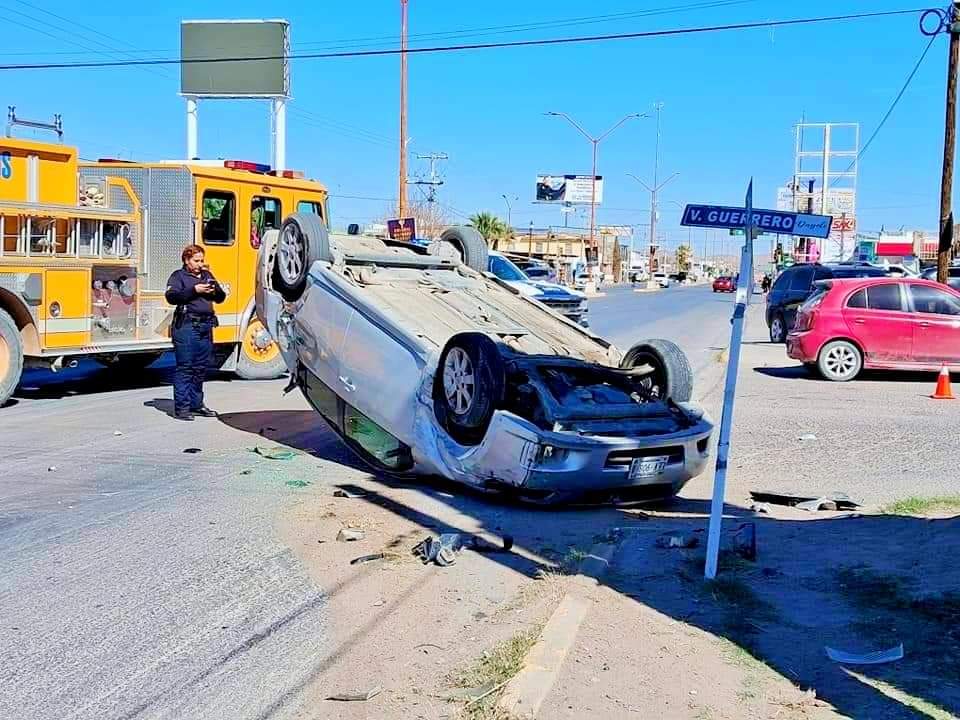 La tarde de este domingo 18 de febrero se sucita accidente automovilístico tipo choque volcadura entre los vehículos Dodge Neon con placas del estado de chihuahua y un Nisan SENTRA también con placas del estado de chihuahua en el boulevard libre comercio y Vicente Guerrero.