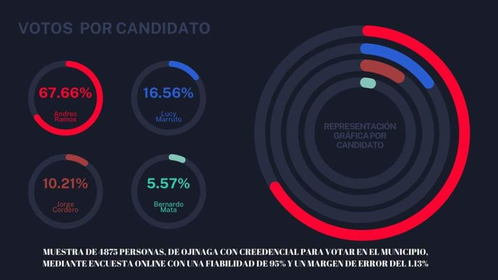 Muestra de 4,875 personas mayores de edad, con credencia del municipio de Ojinaga, mediante encuesta ONLINE con una fiabilidad del 95% con un margen de error del 1.13%.