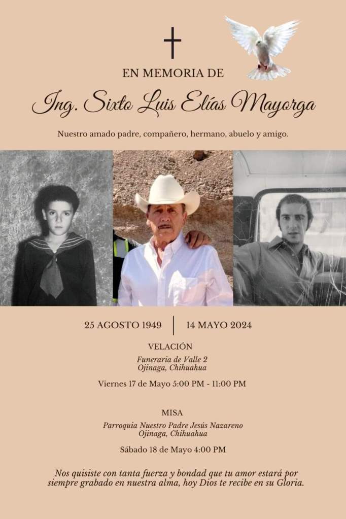 GENERAL,LOCAL,OBITUARIOS 🖤IN MEMORIAM Imagen 16 de mayo de 2024 mone1970 Deja un comentario Ing. Elías Comparte esto: Compartir en X (Se abre en una ventana nueva) X Comparte en Facebook (Se abre en una ventana nueva) Facebook Compartir en WhatsApp (Se abre en una ventana nueva) WhatsApp Compartir en Threads (Se abre en una ventana nueva) Threads Compartir en X (Se abre en una ventana nueva) X Relacionado