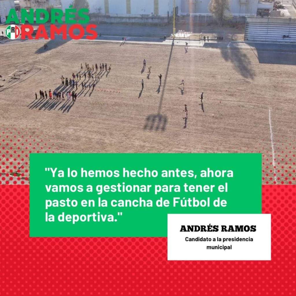 Ojinaga.- Es un hecho comprobado que el Candidato del Revolucionario Institucional, Andrés Ramos, realiza un excelente trabajo de gestión para al apoyo a la comunidad de Ojinaga, una prueba de ello es la obra de colocación de pasto sintético en el estadio de beisbol, la cual fue una gestión de Ramos de Anda ante la Gobernadora del Estado, y hoy en día es una realidad, pues de esa misma forma el Candidato tricolor VA POR EL PASTO SINTÉTICO PARA EL CAMPO DE FUTBOL DE LA UNIDAD DEPORTIVA, así lo dio a conocer a través de sus redes y medios locales, siendo este un compromiso de campaña que estamos seguros se completará cuando regrese a tomar las riendas de nuestro municipio, el abanderado del tricolor.