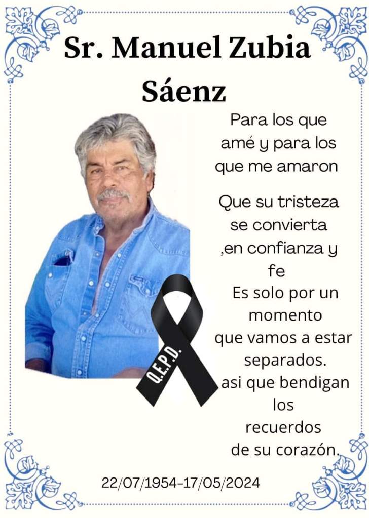 A familiares y amistades del Sr. Manuel Zubia Sáenz se les comunica su sensible fallecimiento a la edad de 69 años en Ojinaga.