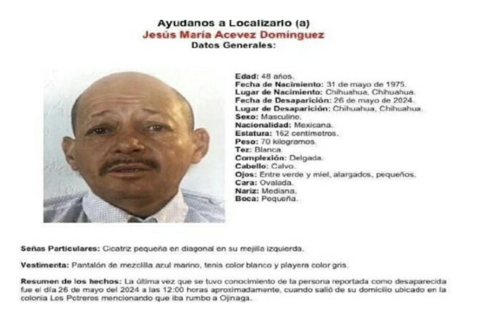 Chihuahua.- Familiares de Jesús María Aceves Domínguez solicitan la colaboración de la ciudadanía para obtener cualquier información que pueda ayudar a dar con su paradero.