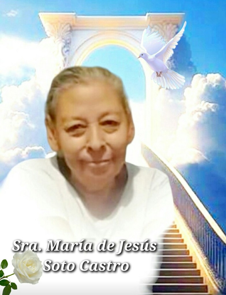 A familiares y amistades de la Sra. María de Jesús Soto Castro, se les comunica su sensible fallecimiento el día de hoy en Ojinaga a la edad de 63 años.