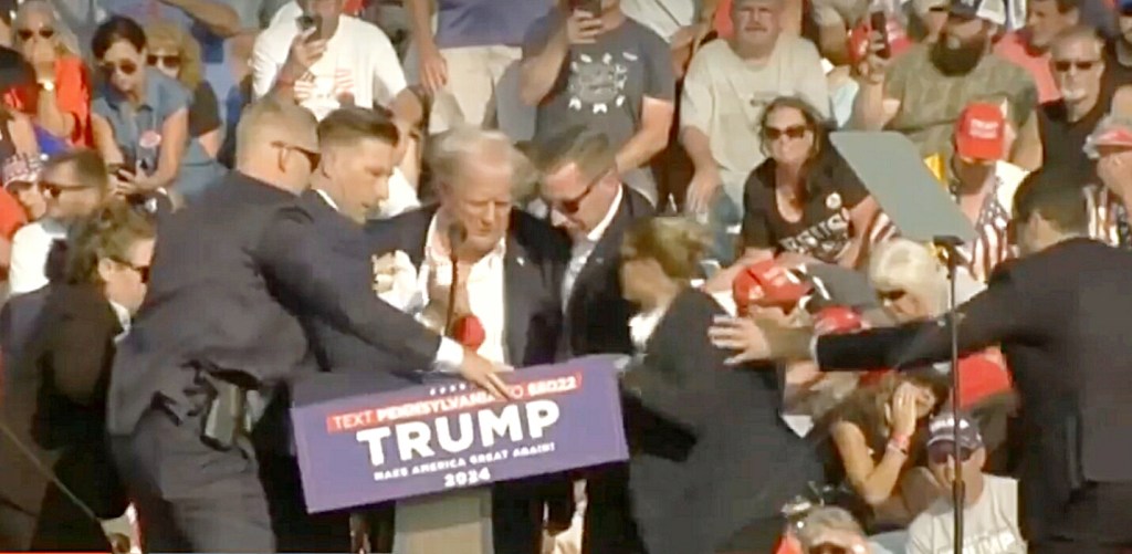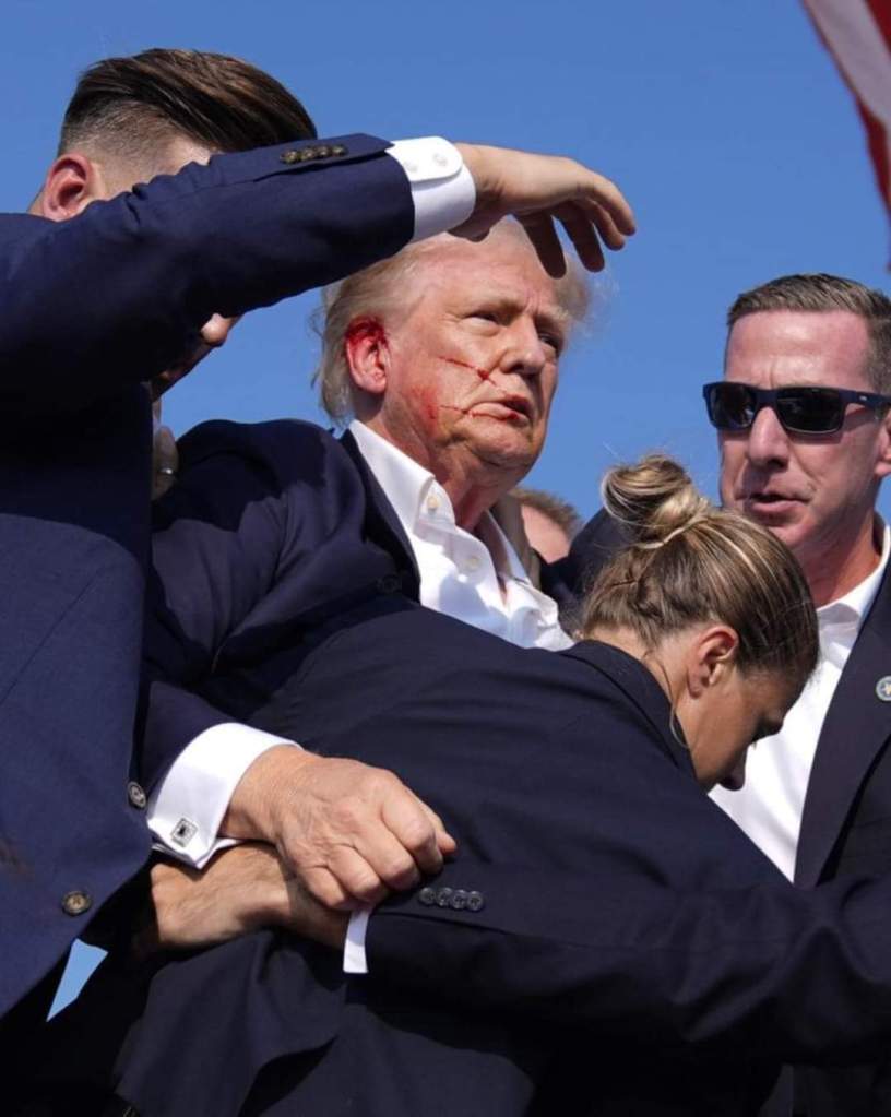 En pleno acto político en Butler, Pensilvania, el expresidente de Estados Unidos y actual contendiente presidencial, #DonaldTrump, tuvo que ser evacuado del escenario por equipo de seguridad, tras presuntamente haber recibido un disparo en la oreja.