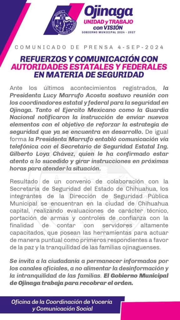Se invita a la ciudadanía a permanecer informados por los canales oficiales, a no alimentar la desinformación y la intranquilidad de las familias. El Gobierno Municipal de Ojinaga trabaja para recobrar el orden.