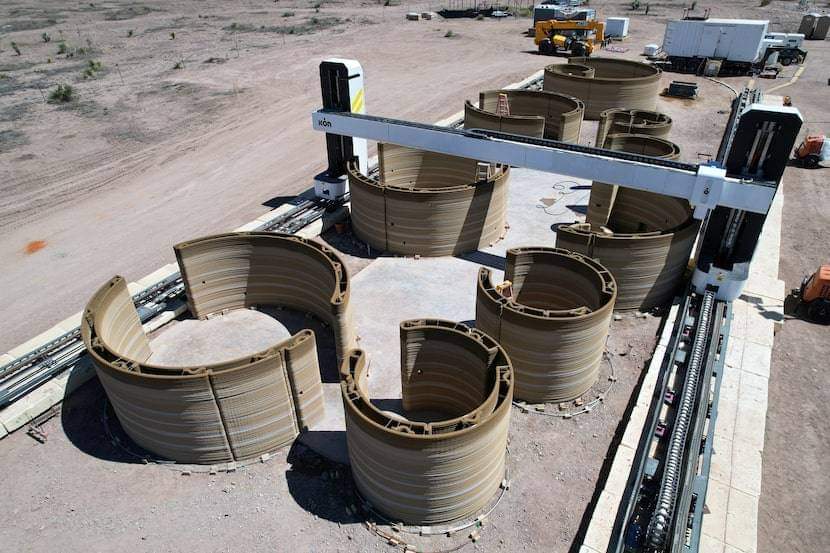 Las sinuosas paredes de color beige están siendo vertidas por Vulcan, la impresora 3D de ICON, que tiene 46.5 pies (14.2 m) de ancho y 15.5 pies (4.7 m) de alto y un peso de 4.75 toneladas.