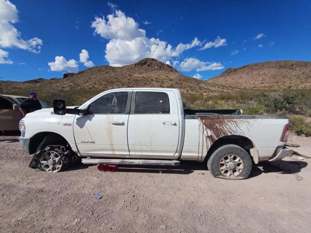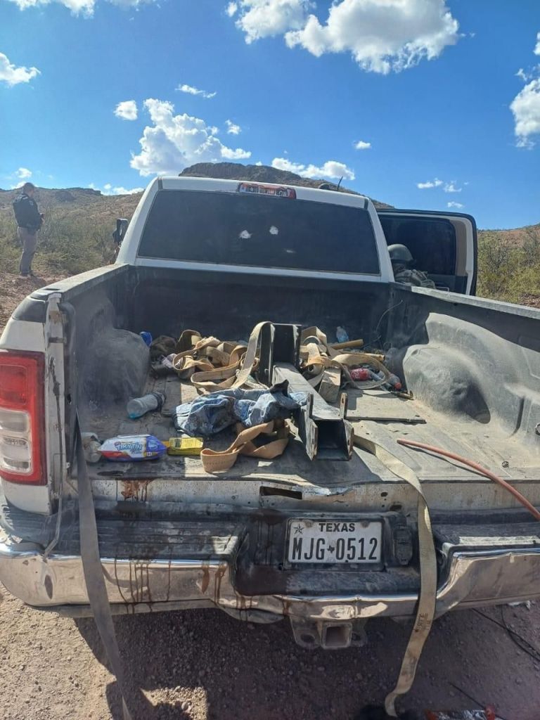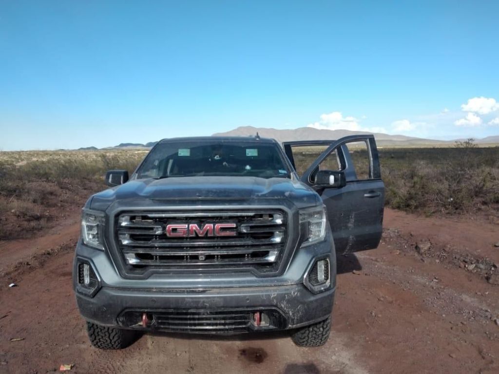 Así mismo al continuar con el operativo por la misma brecha estaba una Pick up Dodge Ram en color blanco con placas del Estado de Texas, la cual presentaba impactos de armas de fuego, en el lugar estaba también una camioneta GMC en color gris con su respectivo número de serie.