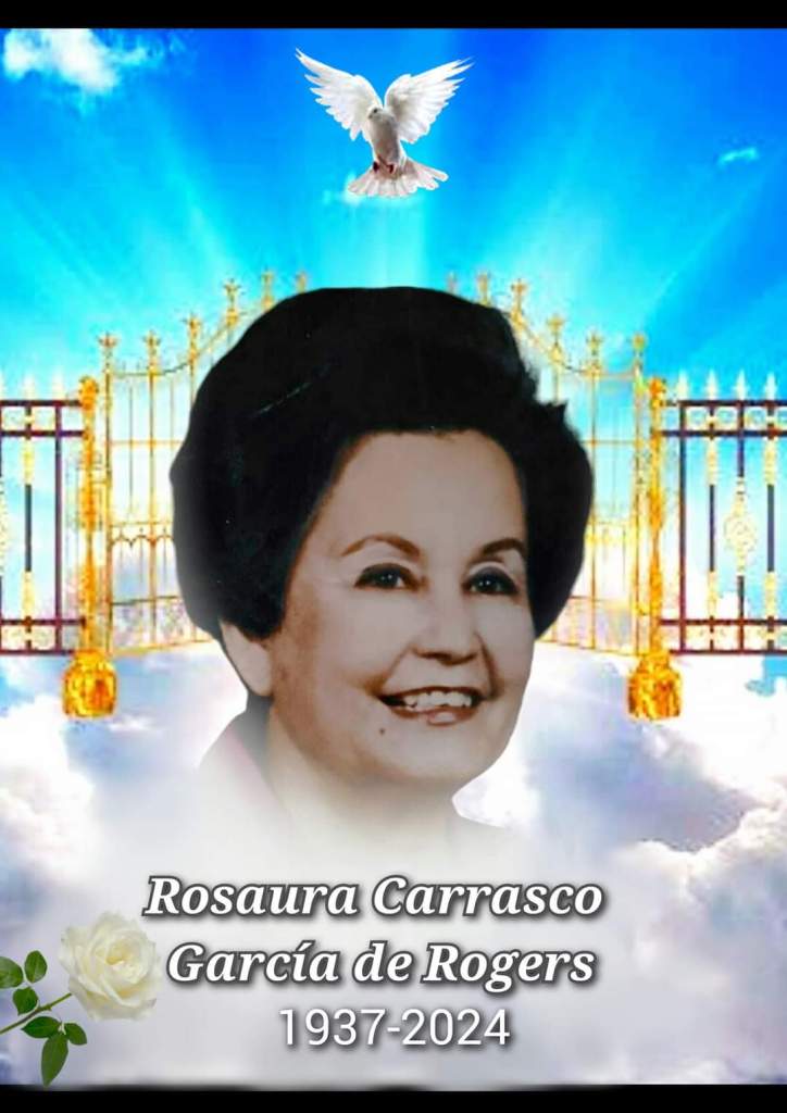A familiares y amistades de la Sra. Rosaura Carrasco García de Rogers, se les comunica su sencible fallecimiento a la edad de 87 años en la Cd. de Phoenix, dónde será sepultada.
