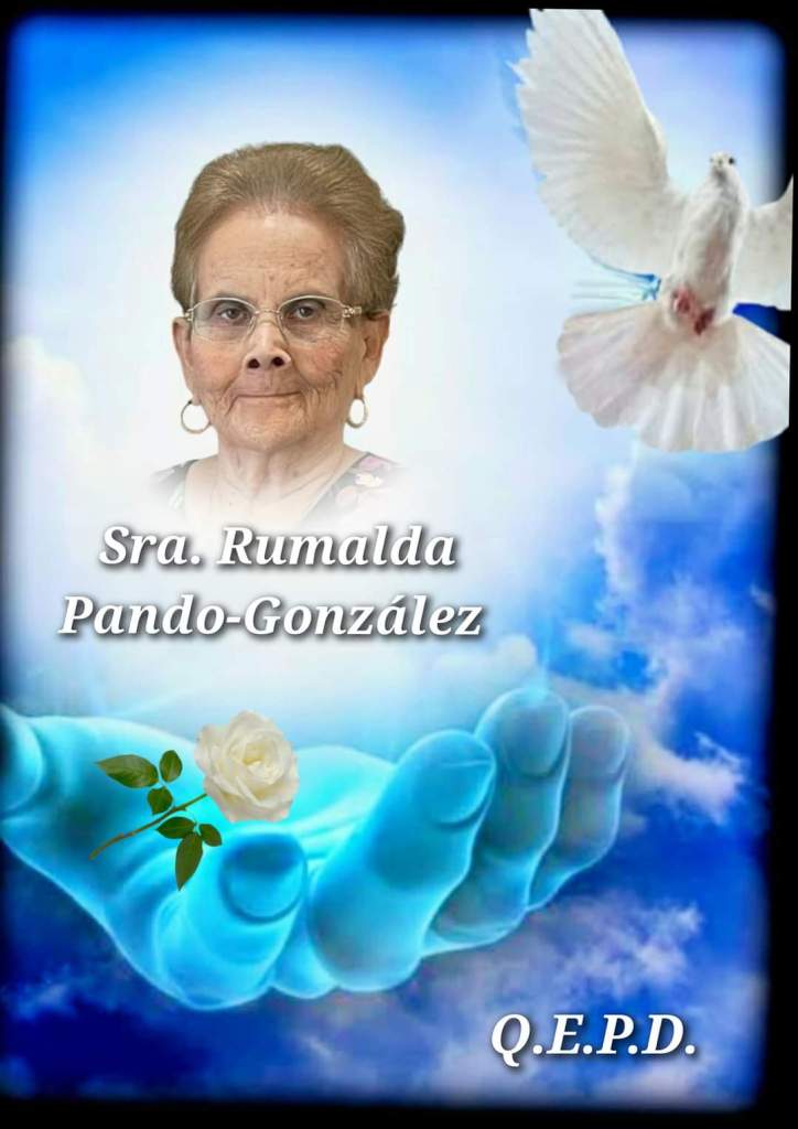 La Sra. Rumalda Pando-Gonzalez, de 84 años, fallecio en San Angelo, Tx. El velorio será el Jueves 21 de Noviembre en Martinez Funeral Home de Odessa. Rumalda nacio en Mulato, Ojinaga, Chihuahua, hija de Ramon Pando y Rebeca Garcia, el 3 de Marzo de 1940. Se caso con Pedro Gonzalez el 10 de septiembre de 1959 en Ojinaga, Chihuahua y tuvieron 3 hijos.