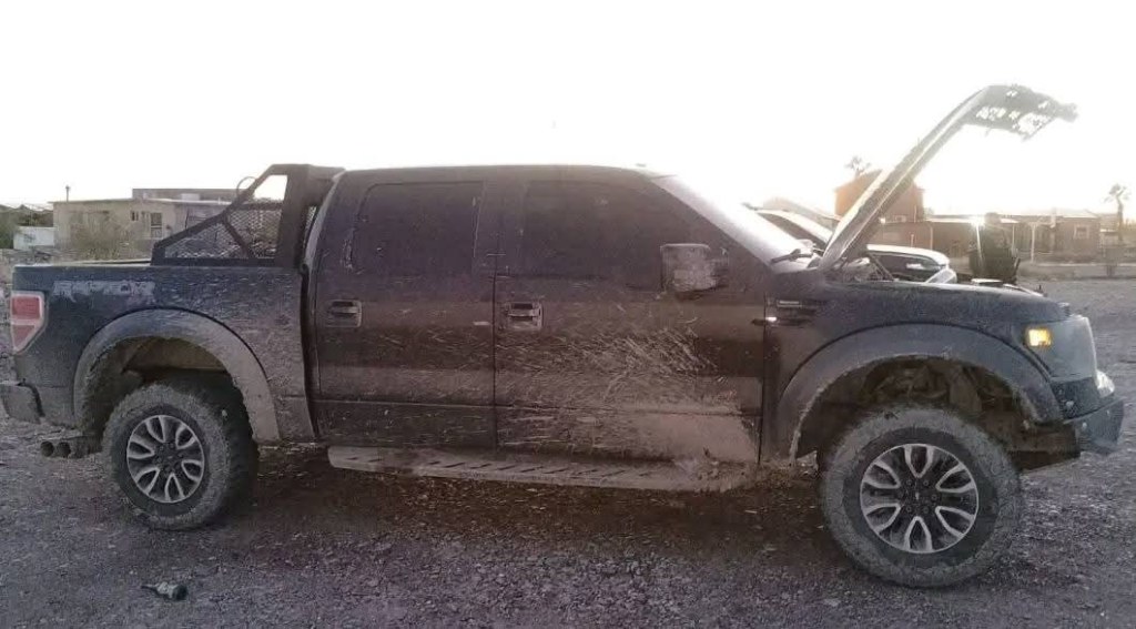 El vehículo asegurado es una Ford F150 color negro, modelo 2013, con placas del estado de Texas. En su interior se identificaron modificaciones sospechosas como una placa de blindaje balístico artesanal.