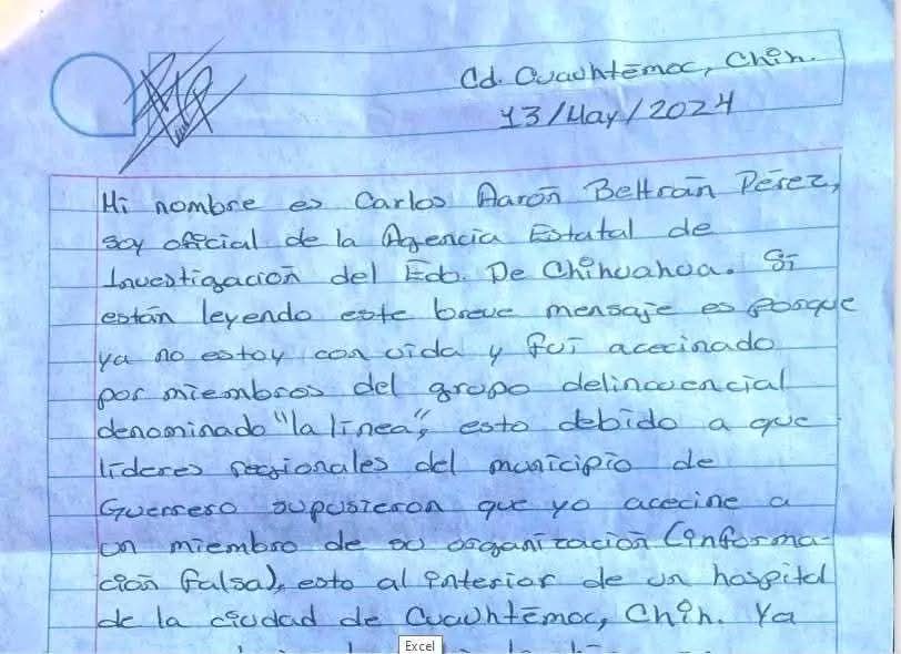 Mi nombre es Carlos Aarón Beltrán Pérez, soy oficial de la Agencia Estatal de Investigación del Edo. De Chihuahua. Si están leyendo este breve mensaje es porque ya no estoy con vida y fui asesinado por miembros del grupo delincuencial denominado “La Línea”, esto debido a que líderes regionales del municipio de Guerrero supusieron que y asesiné a un miembro de su organización (información falsa), esto al interior de un hospital de la ciudad de Cuauhtémoc, Chih. Ya que a decir de ellos lo hice en represalia por el asesinato de mi padre Carlos Ignacio Beltrán Bencomo, ejecución realizada por parte de este grupo en el mes de septiembre de 2020, homicidio que hasta la fecha sigue impune y archivado como muchos otros.