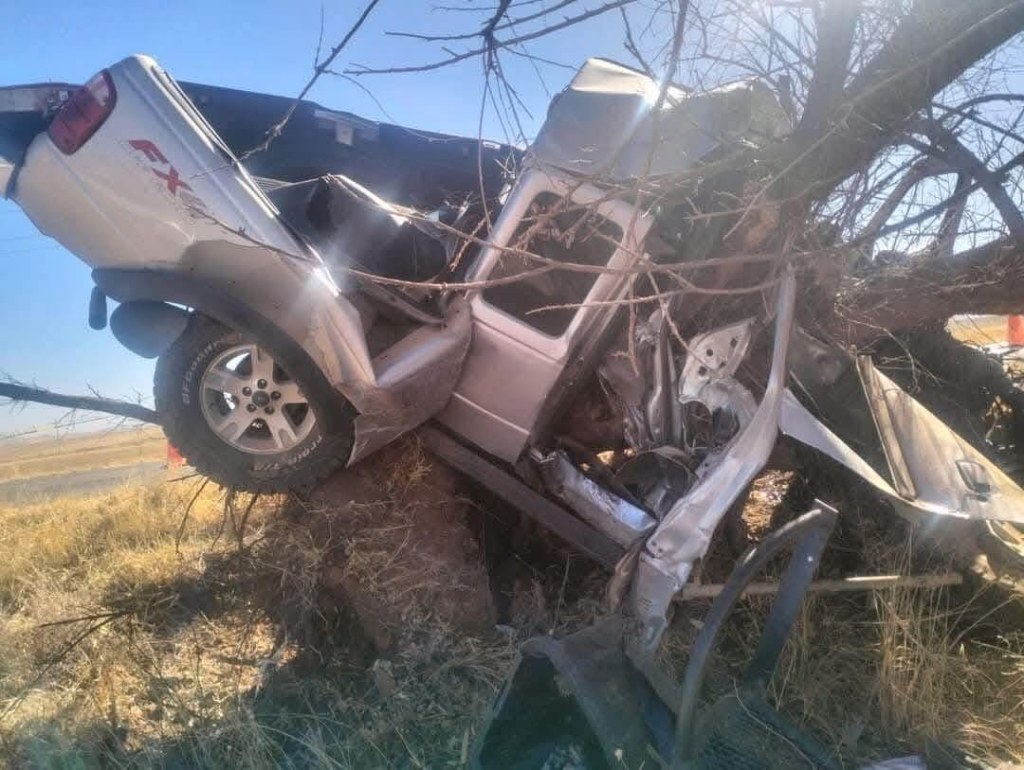 Nos hacen llegar está fotografía que circula en redes sociales y se trata de un fatal accidente en Namiquipa, donde el conductor, un hombre joven pierde la vida al quedar atrapado en la cabina, después de impactar contra un árbol.