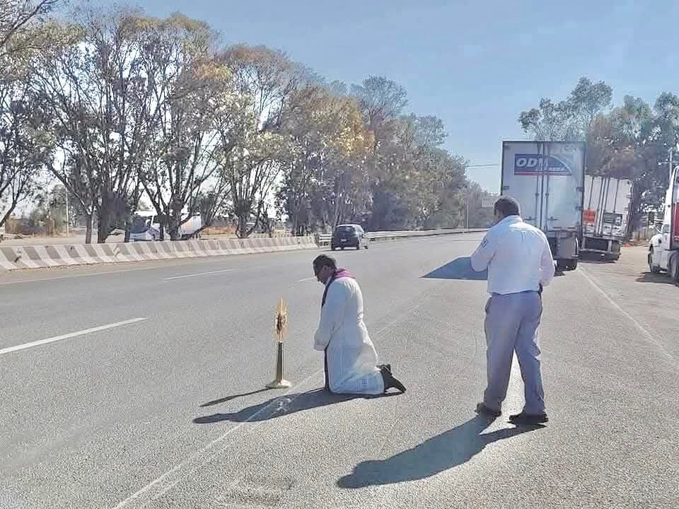 Personal de Caminos y Puentes Federales llevó a un sacerdote para bendecir la autopista México-Querétaro, con el propósito de reducir el número de accidentes vehiculares y asaltos en esta vialidad.