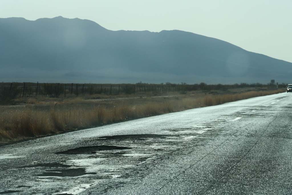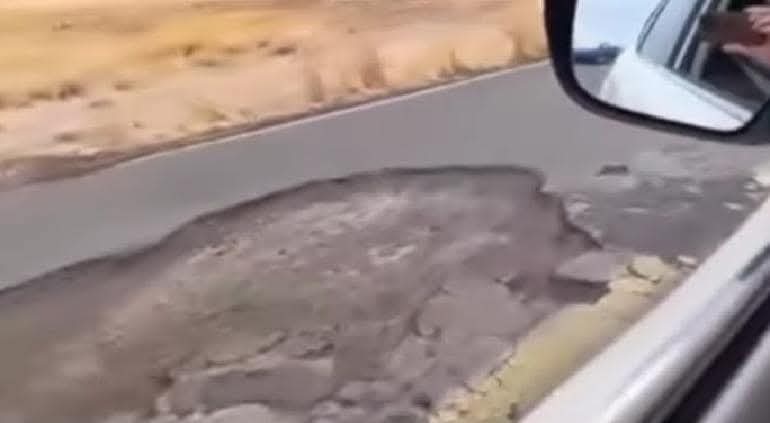 Desde la carretera en Aldama, con dirección a Ojinaga, grabaron un video justo frente a uno de los baches con cerca de dos metros de diámetro que tienen que evitar los conductores del sector.