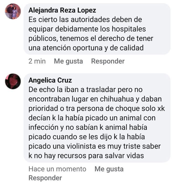 Varios comentarios se han vertido en esta publicación realizada en grupos de redes sociales de Ojinaga en donde las opiniones lamentan el fallecimiento de esta joven mujer y ven la necesidad urgente de que las autoridades de salud atiendan esta necesidad que es crítica en una región desértica como lo es Ojinaga donde las personas están expuestas a una picadura de algún reptil o de algún insecto venenoso y tengan que acudir de emergencia a un hospital de la localidad en este caso de Ojinaga y no existan a ti antídotos y por ende está en riesgo la vida de las personas.