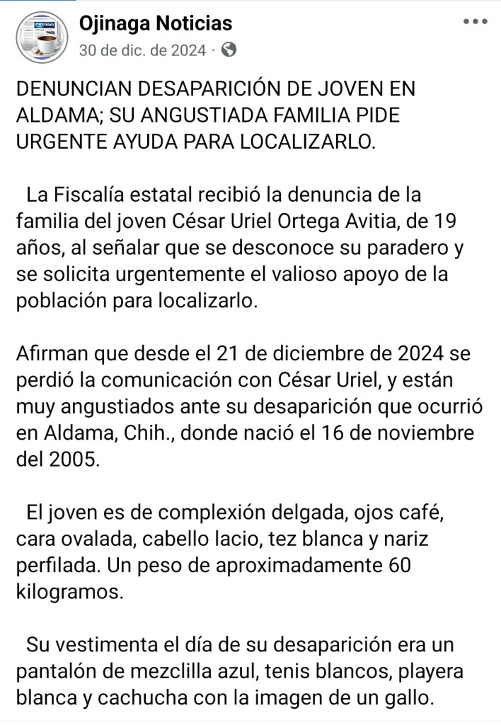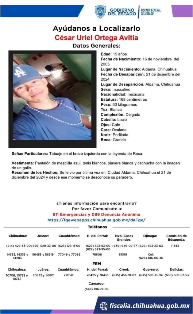 César Uriel relató que fue privado de su libertad en el municipio de Ojinaga, el pasado 21 de diciembre, por sujetos a bordo de un automotor el cual ya no recordaba las características, por lo cual al corroborar en la base de datos, pudieron corroborar que el joven contaba con reporte de desaparición en Aldama, Chih.