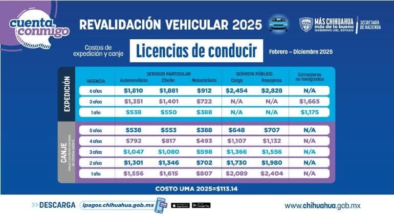 Chihuahua, Chih.- La Dirección de Movilidad y Cultura Vial de la Secretaría de Seguridad Pública del Estado (SSPE), de la cual depende la Coordinación Estatal de Licencias, informó sobre el nuevo ajuste en costos para los trámites de licencias, los cuales entraron en vigor desde inicio de febrero y que tendrán vigencia durante el 2025.