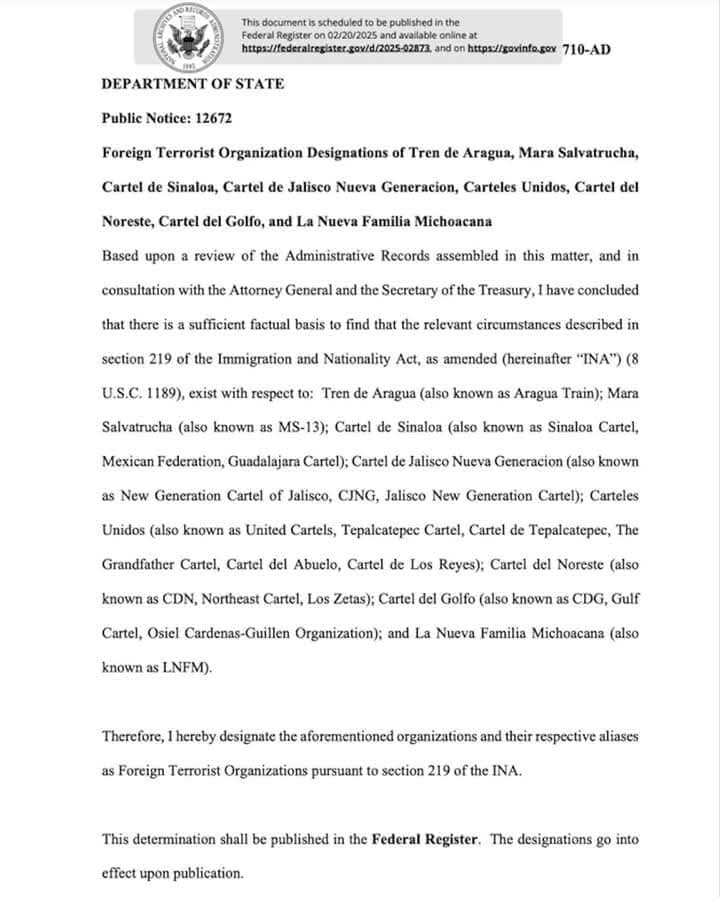 De acuerdo con la notificación del Registro Federal, que se publicará mañana, son seis los cárteles mexicanos los que se encuentran en esta designación de terroristas: