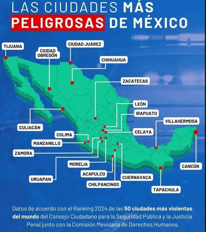 ESTATAL,GENERAL ¿SABÍAS QUE DE LAS 50 CIUDADES MÁS PELIGROSAS DEL MUNDO, 20 ESTÁN EN MÉXICO? TRISTE PERO CIERTO Imagen 24 de febrero de 2025 mone1970 Deja un comentario Comparte esto: Compartir en X (Se abre en una ventana nueva) X Comparte en Facebook (Se abre en una ventana nueva) Facebook Compartir en WhatsApp (Se abre en una ventana nueva) WhatsApp Compartir en Threads (Se abre en una ventana nueva) Threads Compartir en X (Se abre en una ventana nueva) X Relacionado