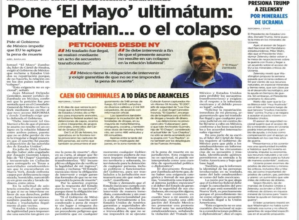 ISmael “El Mayo” Zambada, líder de Cártel de Sinaloa exigió al gobierno de México que reclame a Estados Unidos su repatriación porque, de no hacerlo, la relación entre los dos países sufrirá un “colapso”.