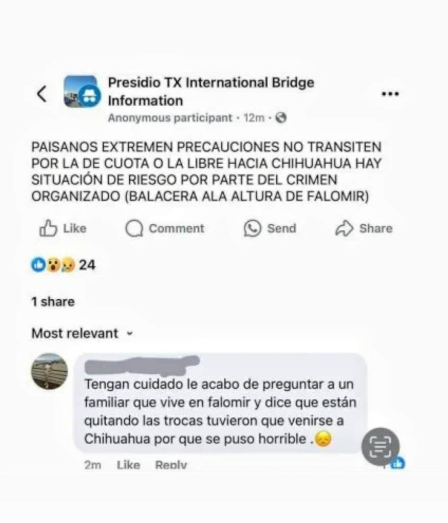 Usuarios de redes sociales advirtieron de la presunta existencia de una balacera a la altura de Estación Falomir, cerca de Maclovio Herrera, seccional de Aldama.“Paisanos, extremen precauciones, no transiten por la de cuota o la libre hacia Chihuahua, hay situación de riesgo por parte del crimen organizado (balacera) a la altura de Falomir”, señaló un usuario de red social.En respuesta, otra usuaria, indicó que acaba de preguntar con un familiar que vive en Falomir y “dicen que están quitando las trocas, tuvieron que venirse a Chihuahua porque se puso horrible”.