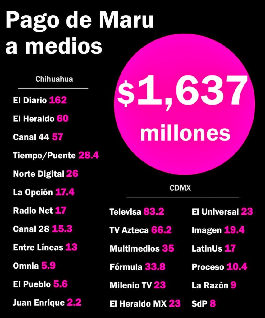 - La gobernadora controla el manejo informativo de casi todos los medios en el estado de Chihuahua, mediante convenios publicitarios en televisión, radio, medios impresos y digitales, cine, carteleras y pagos a conductores.