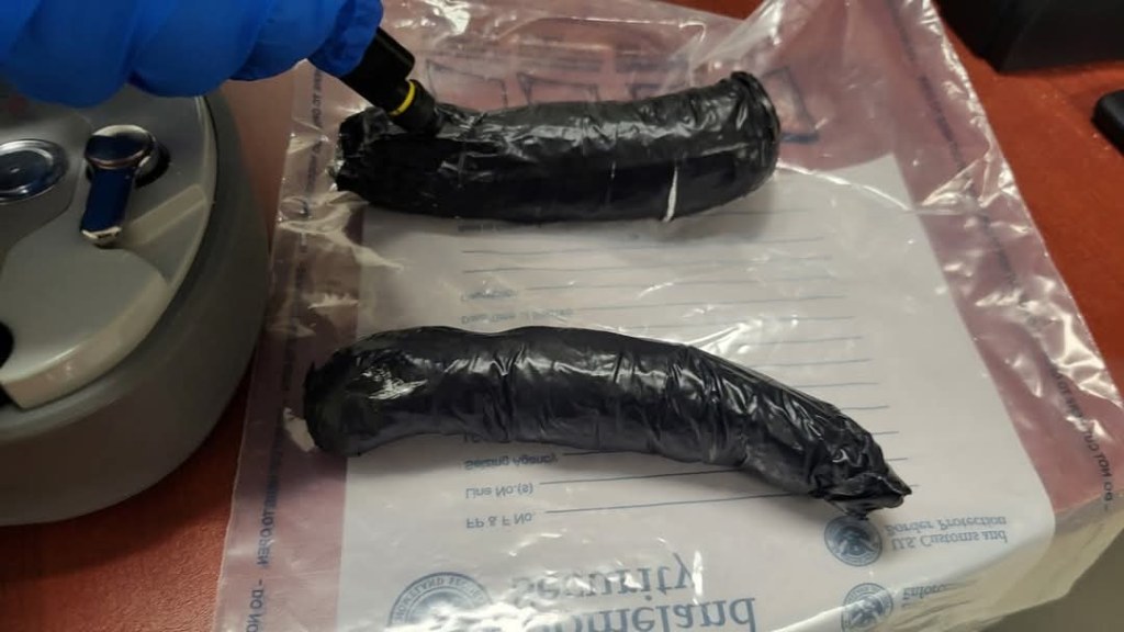 Un oficial de CBP realizó un cacheo parcial y descubrió dos paquetes ocultos entre las nalgas del hombre, según el comunicado de prensa.