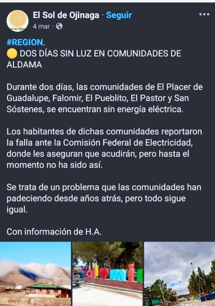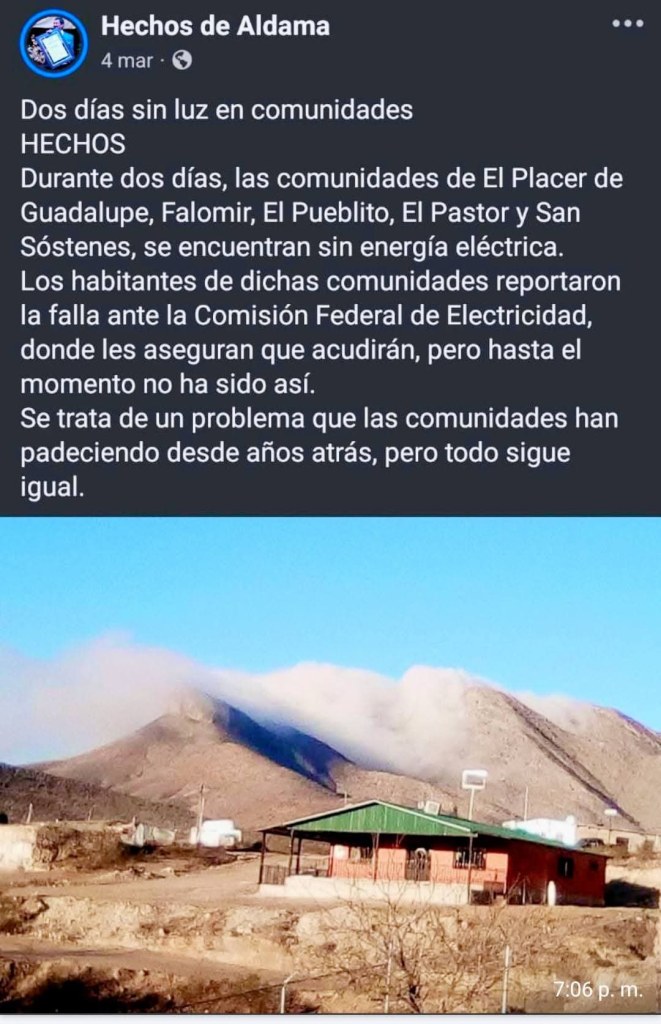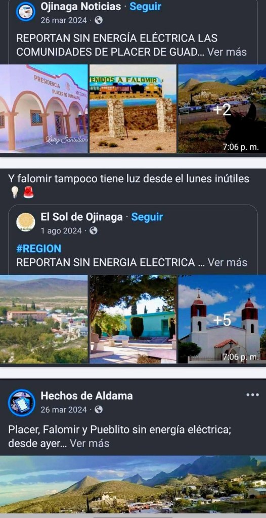 Buenas tardes, le pedimos de favor si es posible nos ayude a compartir la siguiente información 🙏 ya que Falomir, pueblito y placer de Guadalupe llevan 2 días sin luz, sin señal y sin agua.