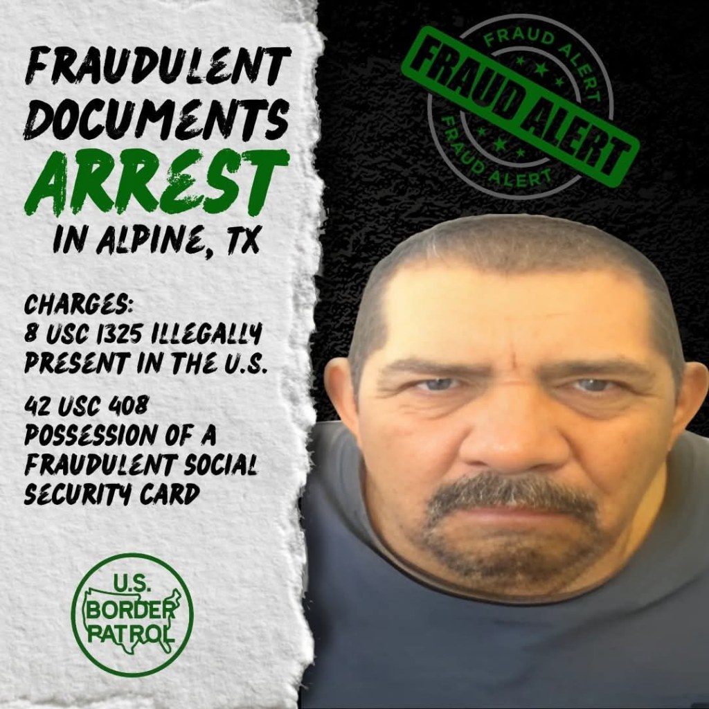 El Sector Big Bend de la Patrulla Fronteriza de Estados Unidos anunció que agentes del puesto de control de Alpine, Texas, identificaron recientemente a un individuo en posesión de una identificación fraudulenta y una tarjeta de Seguro Social falsa .