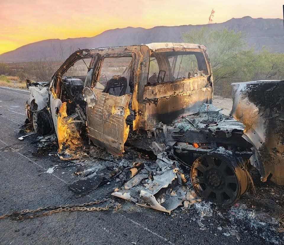 Más adelante, sobre la carretera, localizaron dos vehículos totalmente calcinados y a la altura del kilómetro 76, se localizó una pick up de la marca Ford FX4 color negro, cuatro puertas abandonada.